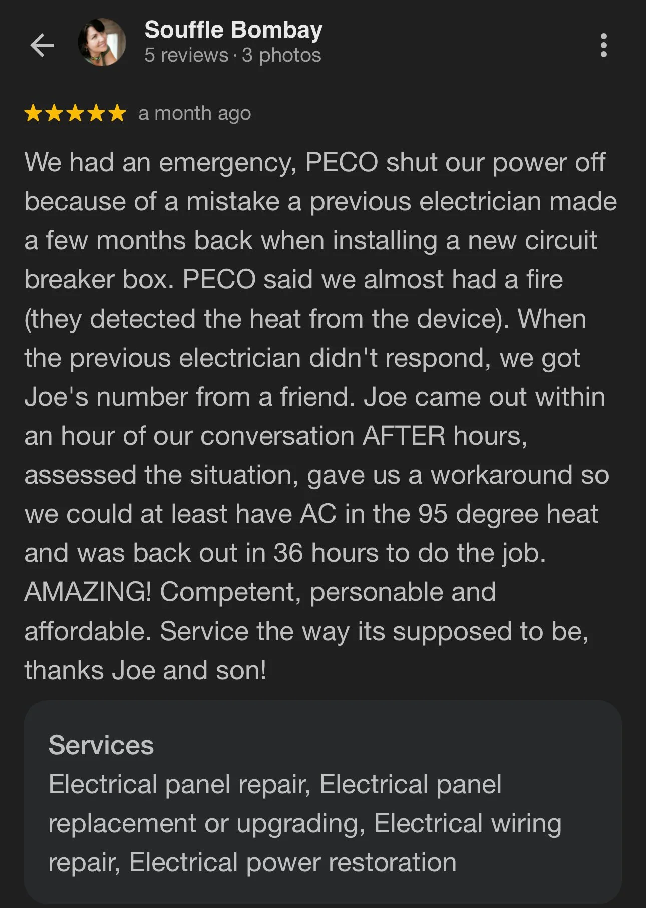 Let’s work together Need an estimate, repair, or emergency service? We’re here 24/7 to keep your home or business running safely. Name * First Name Last Name Email * Phone (###) ### #### Service Needed * Panel Upgrade Generator Residential Commercial Other Message * Thank you for reaching out to JCJ Electric. A team member will get back to you shortly. For emergency services, please call 267-240-4700 or 267-294-8959